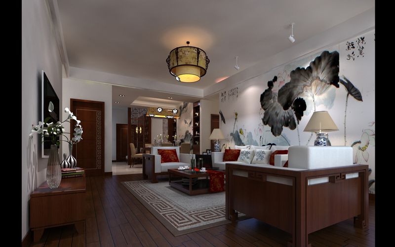 進(jìn)門處的屏風(fēng),有效地劃分了空間的層次感,更加有效地延伸了就餐空間。電視背景墻采用以荷花為主題的墻面噴繪,整個(gè)氛圍輕松,而且?guī)в泻苫ǔ鲇倌喽蝗镜臍夤?jié),更加吻合新中式的口味。